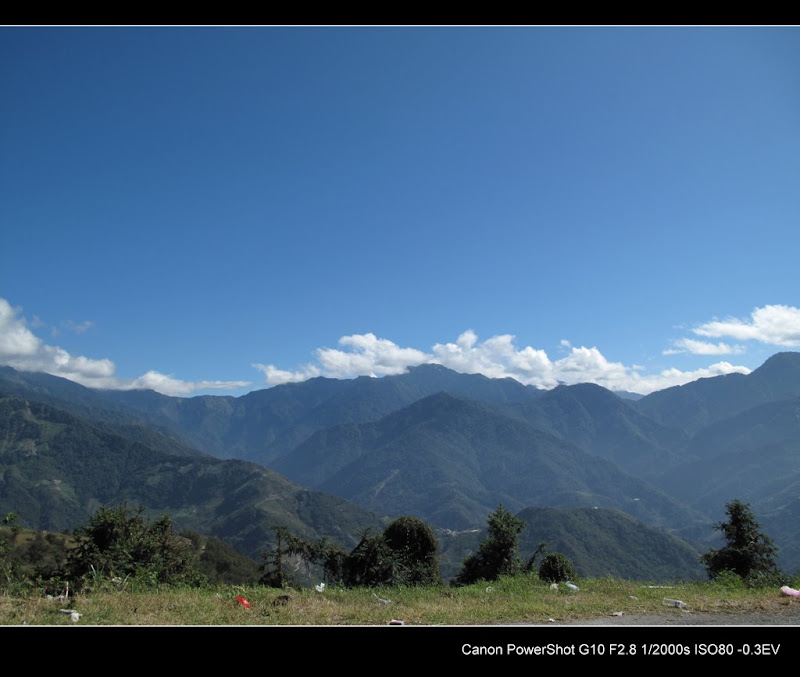慢慢離開埔里進入山區,這一兩天不管怎麼看都美的像幅畫一樣,綿延不絕的山,藍到快要爆掉的天空,每每過了個彎道之後,眼前全都是驚喜,有時候在想,雖然坐車上來或許很舒服,但是,應該沒辦法體會到那種遼闊感吧~
