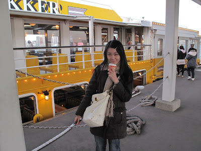 搭上了水上巴士,沿著河邊慢慢的向新之內站前進,我們的目的地是台場,雖然很冷,但是看著沿河的風景,終於可以悠悠哉哉的,覺得這才是渡假啊~,雖然很冷,抵達台場之後,我們趕快衝去吃飯,然後到對面的富士電視台(好像是這個名字),結果,球體的展望台又關了,樓下的商店也關了,本想以為買不到戀愛巴士的紀念品,沒想到在旁邊的販賣機有販賣,真是令人高興呢~就馬上投了一個很可愛的戀愛巴士的禮盒帶回家~。(但是後來發現身後有個便利商店也有賣呢....無言)