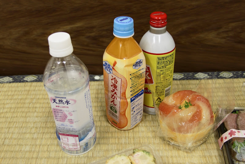 其中有...花見便當(特價)、綜合炸物(特價)、甜醋炸蝦、比司吉2個以及我超愛的水果甜點!看起來少歸少,我們兩個還差點吃不完...