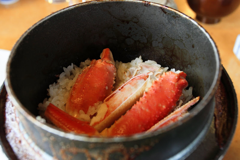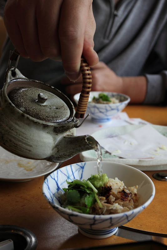 這玩意是最後的壓軸!螃蟹鍋粑飯!就是把悶熟的螃蟹肉放進飯裡面攪拌,先吃一碗螃蟹飯,最後再加茶,在來上一點點沙西米提味,變成好吃的茶泡飯