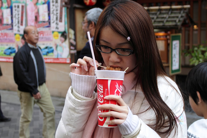 好吃嗎?我們兩個是否定的,應該說,不太合我們的胃口,不過這個有趣的是,這個容器構造還滿有趣的,上層有個小碗裝著章魚燒當做飲料的杯蓋,吸管就從小碗旁邊伸出來,一手拿著,雙重享受!