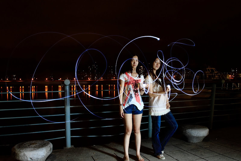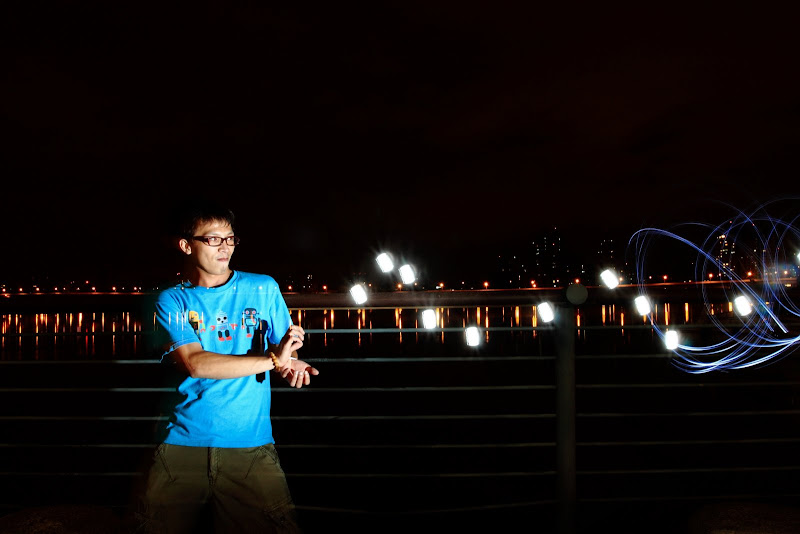 話說賴大濕跟阿宏大濕不知道是誰誰洗腦誰,一整個在禮拜六晚上,一群人浩浩蕩蕩的跑去相機街買了CPL,而且好笑的是不知道要去哪裡拍,全部人相機都帶在身上,賴大濕還帶了腳架,真的好像有這麼一回事要去哪個地方拍夜景的,結果在買完CPL吃完摩斯漢堡,說要去大稻埕碼頭,我可以說,這絕對是臨時起意要去的啊~~ 到了那邊,大家就開始拍拍對岸,我原本是想要在拍閃燈人像的,不過想想這樣有點無聊,也沒有什麼好看的背景可以拿來用,那邊是一個騎腳踏車的好地方,也有看到超級炫的阿伯騎著有如電子花車的腳踏車從我面前經過,我靈機一動馬上跑到後面有賣腳踏車零件的地方,買了一組小小的LED燈,開始玩起了PICAPICA~(終於想到可以玩這個了)