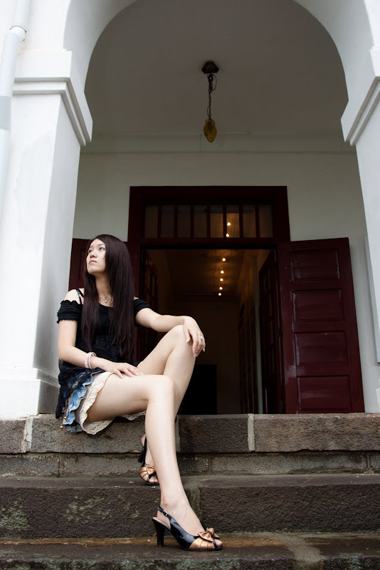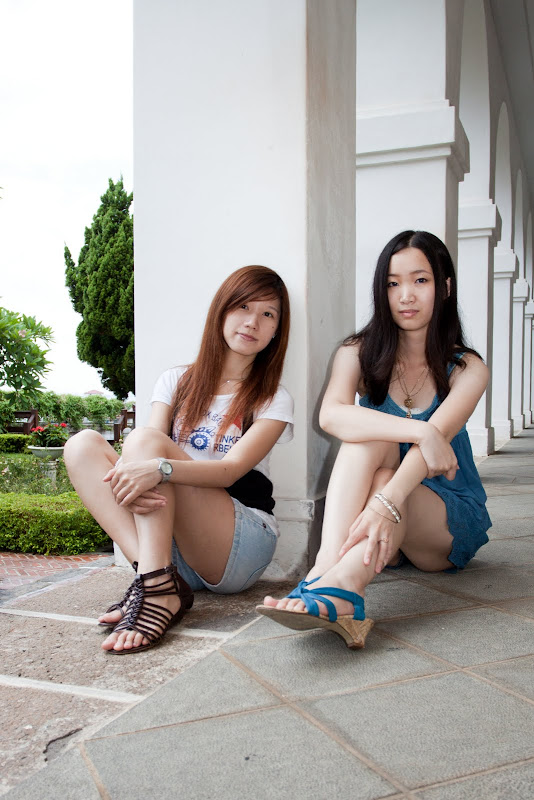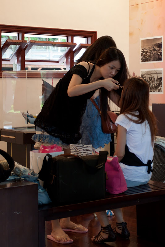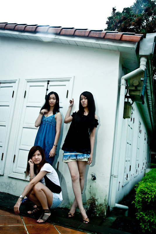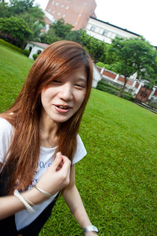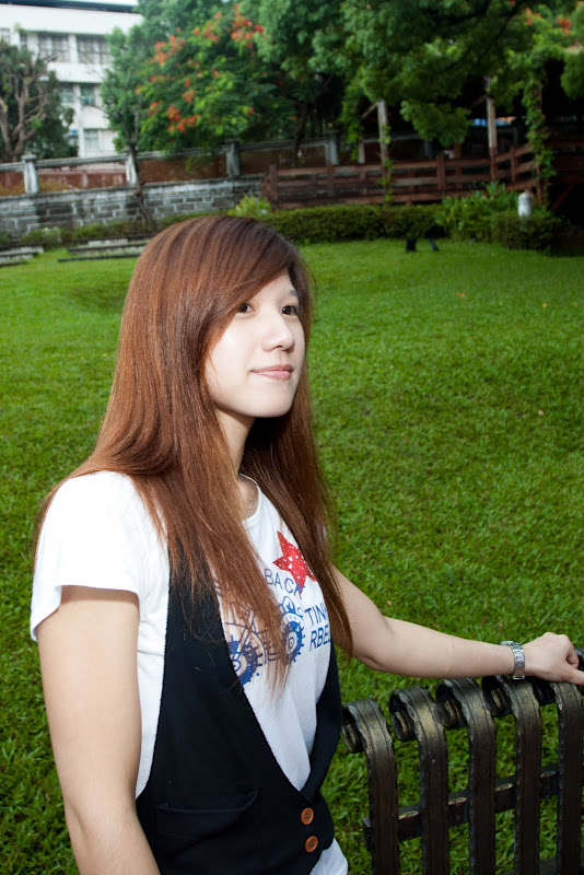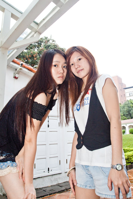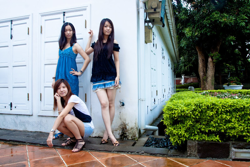 一到那邊我們一大群人就往室內鑽去,說真的,我們這群人真的是有點小糟糕,一下攝影包包+腳架袋就堆滿椅子上了...另外順帶一提,裡面是不可開閃燈的喔!而呆呆文就先幫鴨子弄個妝,這時候好像是在夾眼睫毛...不過很快發生慘事,呆呆文夾著夾著就夾到鴨子的眼皮啦!!!!!鴨子唉了一大聲,這個作業馬上就停止了...另外順帶一提,裡面是不可以補妝化妝或是夾眼睫毛喔!而鴨子真的是諧星命,雖然很可憐,但是我覺得滿好笑的~哈,然後文傑就準備要玩他的離機閃設備,正當他的離機腳架上放上迴廊,就被工作人員制止了...希望這些相關規定能寫的更清楚一些,也由於這樣我們一瞬間違反超多沒看到的規定,我們就一直被工作人員緊盯著到離開為止...