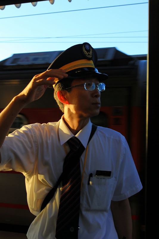 超極速搶拍!剛好日落時分,我一回頭看到車掌出外車廂巡視的光影變化真的很棒,馬上用極快的速度拍了下來~